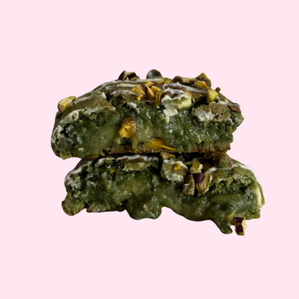 Een chunky koekje van ongeveer 185g vol rijke witte chocolade en knapperige pistachenootjes, met een romige pistachevulling die smelt op je tong. Bovenop extra pistachenoten voor die perfecte crunch. Een onweerstaanbare combinatie van zacht, romig en nootachtig – puur genieten in elke hap!